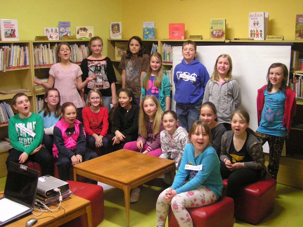 Sešlo se sedmnáct dětí z obou skutečských základních škol – tři kluci a čtrnáct holek (z nichž tři se během večera několikrát stali podezřelými ze zločinu) , knihovnice a tradičně pan učitel Štěpán Doležal.